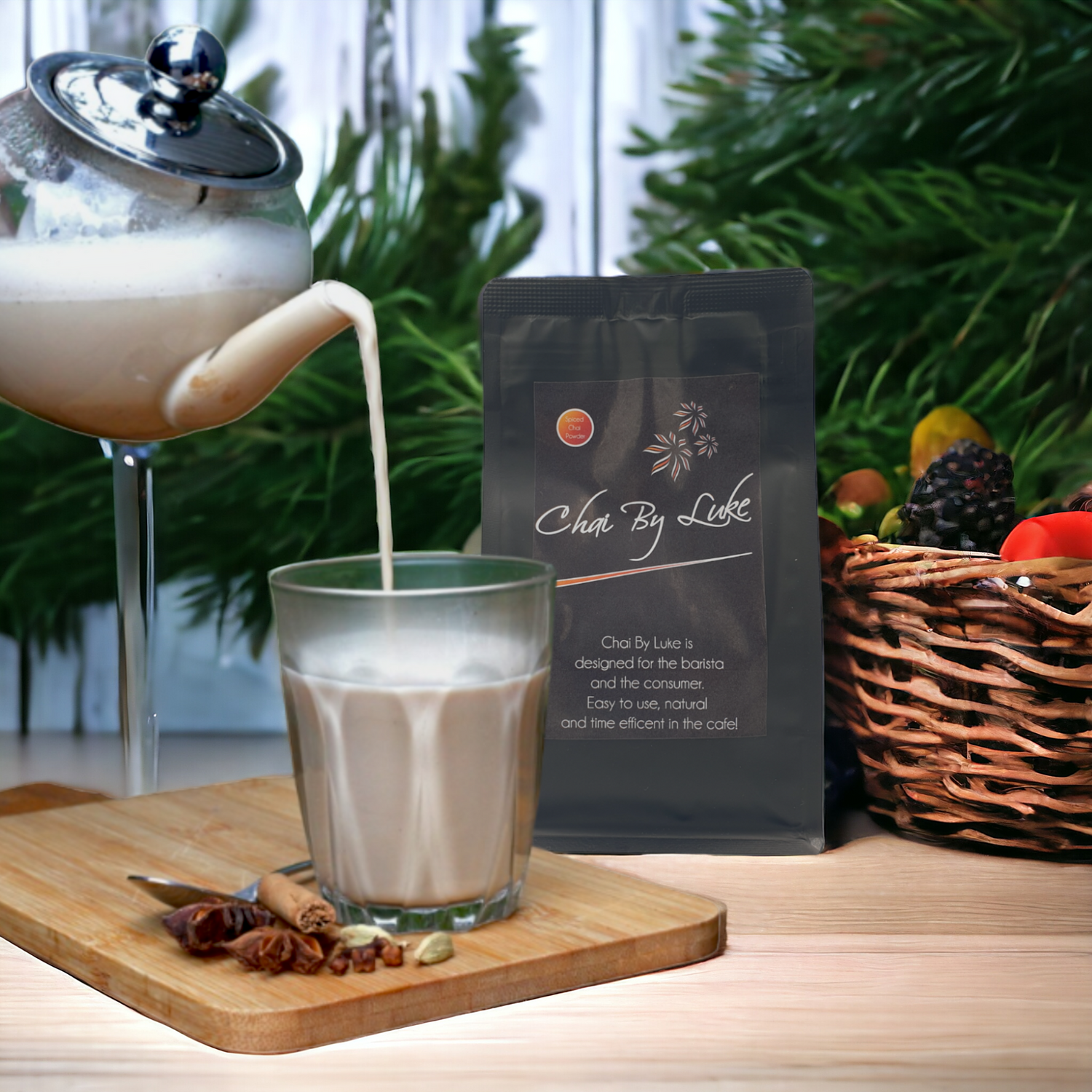 For cafe use brew a tablespoon of Chai by Luke Wet Chai in 40mls of boiling water. Top up with desired milk and heat with steam wand, strain and serve.